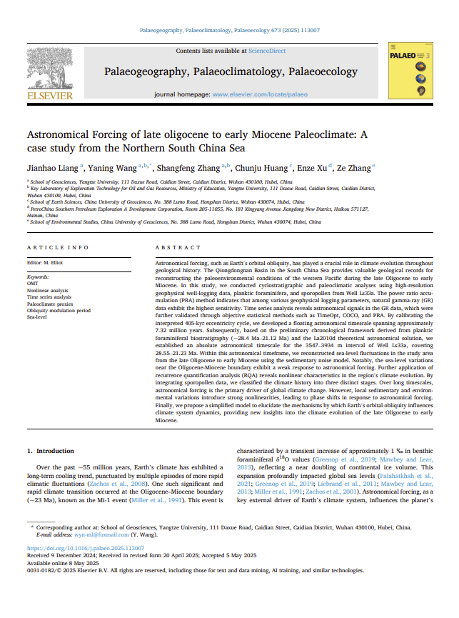 太阳成集团122ccvip地质学专业硕士研究生梁建昊以第一作者身份在中科院二区TOP期刊《Palaeogeography, Palaeoclimatology, Palaeoecology》发表题为“Astronomical Forcing of Late Oligocene to Early Miocene Paleoclimate: A Case Study from the Northern South China Sea”的研究论文。太阳成集团122ccvip为第一署名单位,王雅宁副教授担任唯一通讯作者,研究获得国家自然科学基金资助。