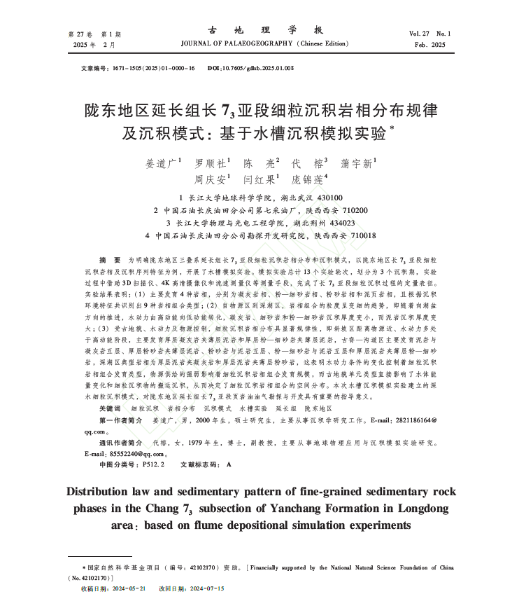 太阳成集团122ccvip硕士生姜道广在《古地理学报》上发表题为“陇东地区延长组长73亚段细粒沉积岩相分布规律及沉积模式:基于水槽沉积模拟实验”的研究论文。该论文,以陇东地区长73亚段细粒沉积岩相及沉积序列特征为例,开展了水槽模拟实验并借助3D扫描仪、4K高清摄像仪和流速测量仪等测量手段,完成了长73亚段细粒沉积过程的定量表征。