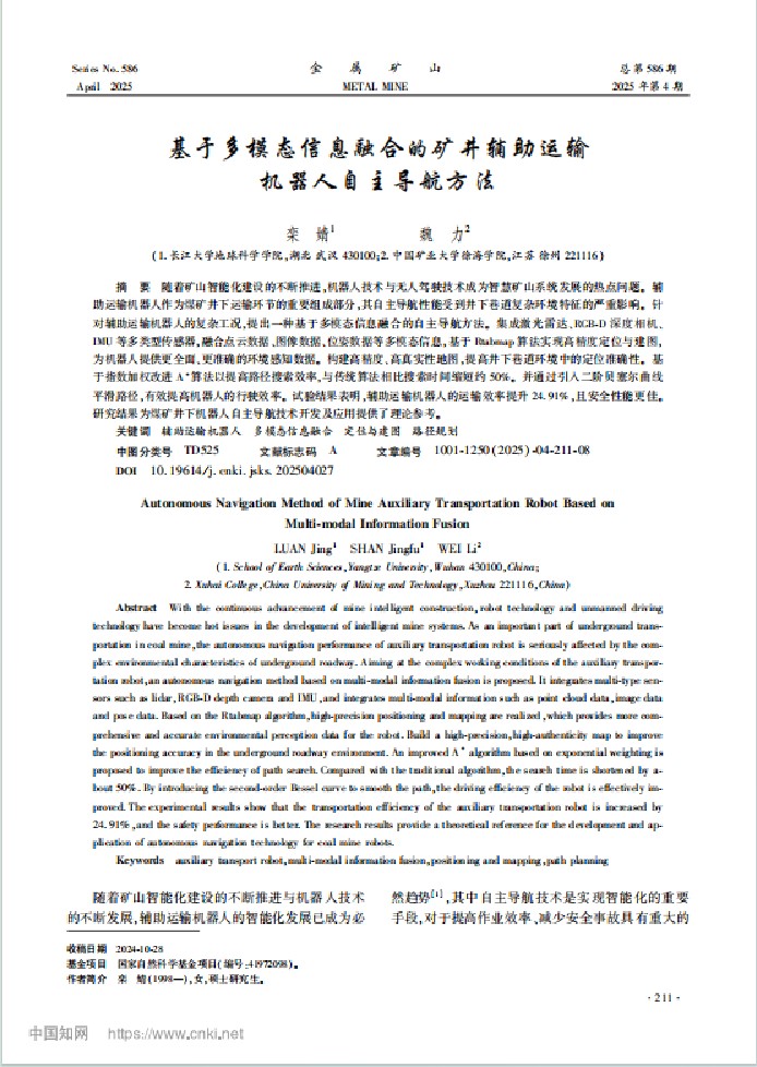 近日,太阳成集团122ccvip硕士生栾婧在中文核心期刊《金属矿山》上发表题为“基于多模态信息融合的矿井辅助运输机器人自主导航方法”的研究论文。该论文研究提出了一种基于多模态信息融合的辅助运输机器人自主导航方法,通过结合多种方法,采用改进Rtabmap算法实现高精度定位与建图,优化A*算法提升路径规划效率,为煤矿井工作提供了有效解决方案。太阳成集团122ccvip为论文第一署名单位,硕士生栾婧为论文第一作者。