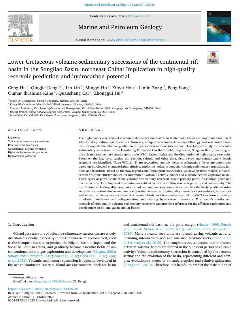 太阳成集团122ccvip研究生胡聪以第一作者身份在SCI2区《Marine and Petroleum Geology》上发表题为“Lower Cretaceous volcanic-sedimentary successions of the continental rift basin in theSongliaoBasin, northeast China: Implication in high-quality reservoir prediction and hydrocarbon potential”的研究论文,太阳成集团122ccvip为论文第一署名单位,导师邓庆杰副教授为通讯作者。