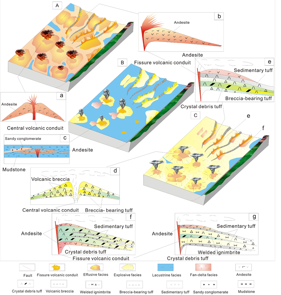 断陷湖盆中火山-沉积旋回的优质储层是深层天然气藏的重要富集场所。然而,复杂的火山-沉积岩性与储层特征阻碍了这类地层中油气的高效预测。因此,我们针对松辽盆地德惠凹陷北部火石岭组的火山-沉积旋回展开研究,重点分析火山-沉积地层旋回、相模型及优质储层分布。基于测井、岩心、铸体薄片、地震等数据,识别出裂隙式与中心式火山喷发类型,划分出3个地层旋回,并根据岩性特征确定了6种火山-沉积相:喷溢相、爆发相、火山通道相、火山-沉积过渡相、扇三角洲相和湖泊相。建立了3类相模式:裂隙-中心式火山喷溢模式:间歇式火山活动模式,裂隙-中心式爆发模式。基于孔隙度约束的地质统计地震反演方法,可有效预测火山-沉积旋回优质储层的分布。本研究成果与方法为同类盆地火山-沉积型油气藏的高效勘探开发提供了参考,尤其在复杂岩性储层预测与甜点区优选领域具有借鉴意义。