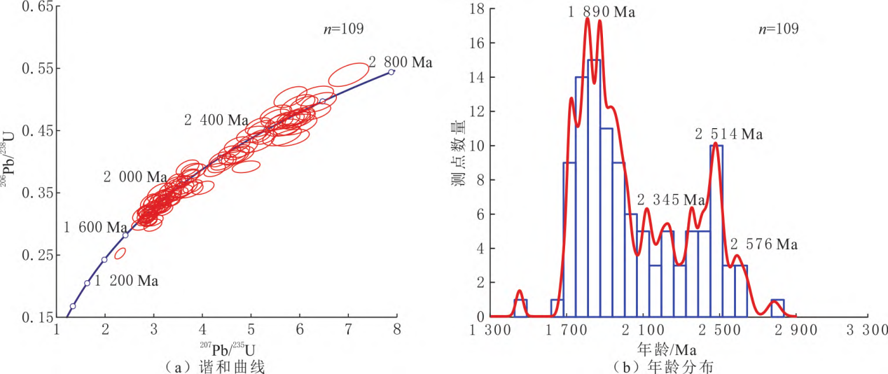 图2.贺兰山拜寺口剖面中元古代黄旗口组碎屑锆石 U-Pb谐和曲线及年龄分布