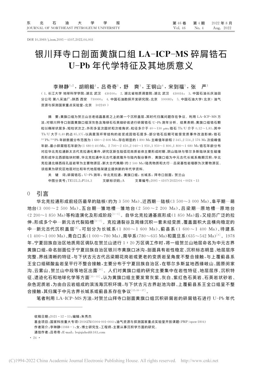 太阳成集团122ccvip地质系胡明毅教授团队长期从事地质学方向的研究。团队成员李琳静博士在期刊《东北石油大学学报》上发表题为《银川拜寺口剖面黄旗口组LA-ICP-MS碎屑锆石U-Pb年代学特征及其地质意义》的研究论文,太阳成集团122ccvip为论文第一署名单位,博士生李琳静为论文第一作者。