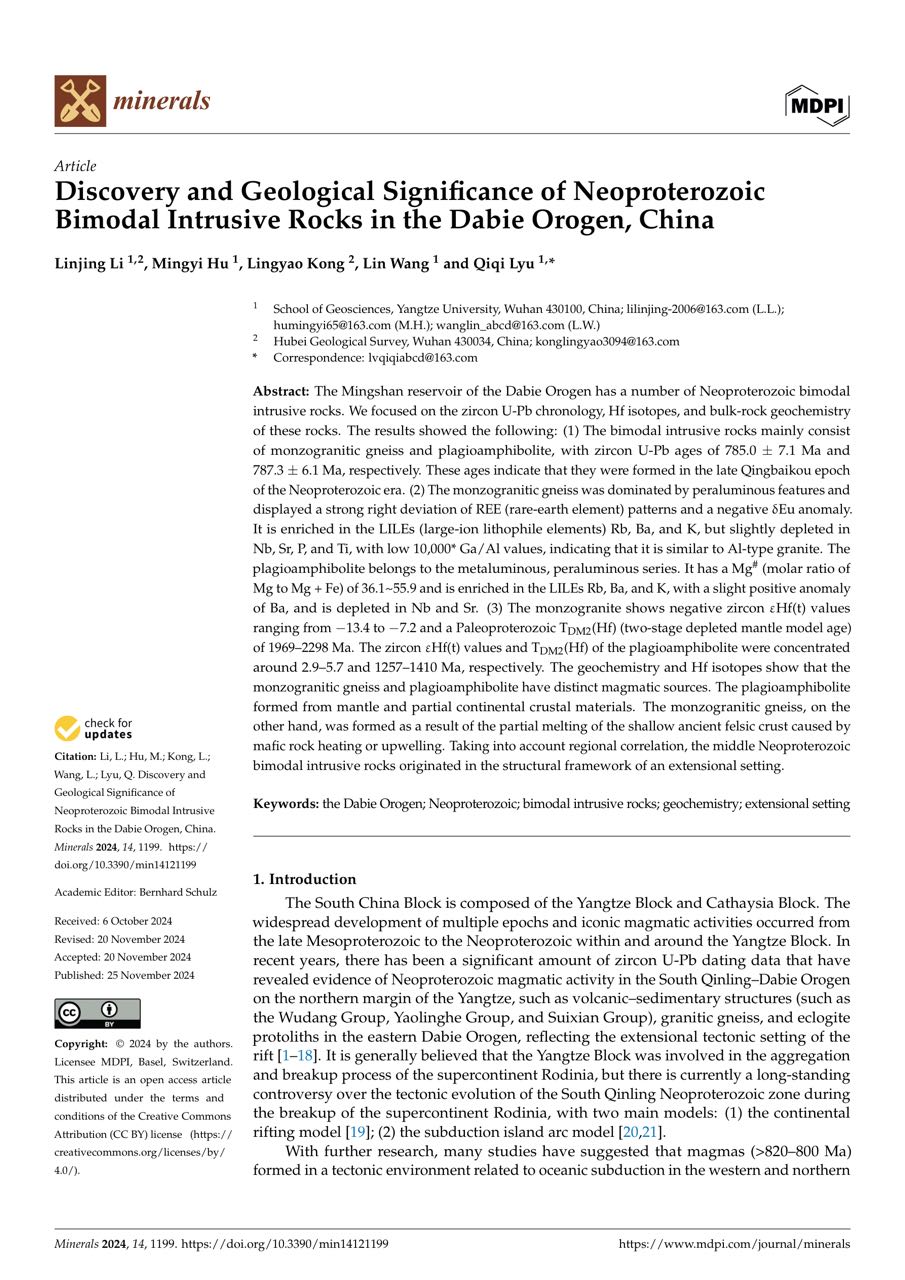 太阳成集团122ccvip地质系胡明毅教授团队长期从事地质学方向的研究。团队成员李琳静博士在期刊《Minerals》上发表题为《Discovery and Geological Significance of NeoproterozoicBimodal Intrusive Rocks in the Dabie Orogen, China》的研究论文,太阳成集团122ccvip为论文第一署名单位,博士生李琳静为论文第一作者。