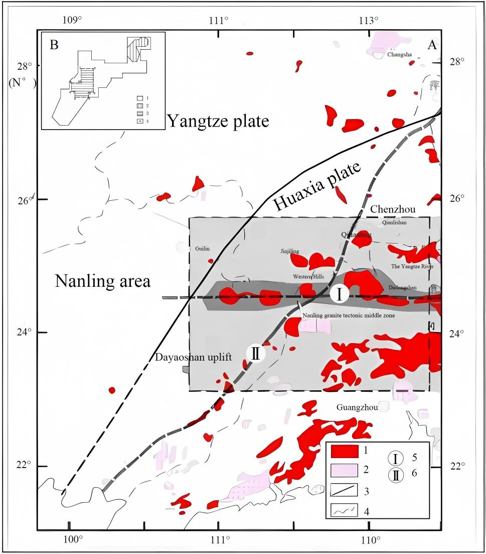 研究表明,(1)广西东南部稀土矿床以花岗岩风化壳离子吸附型为主,稀土元素以离子吸附态形式富集于风化壳中,尤以完全风化层中含量最高,且以轻稀土元素(La、Ce、Pr、Nd)为主。风化过程中,高岭石、长石和蒙脱石等矿物对稀土元素的富集起到关键作用。(2)风化壳结构自上而下分为表土层、完全风化层、半风化层和基岩四层,稀土元素的富集与风化程度、矿物成分变化及初始岩石稀土丰度紧密相关。稀土矿化与花岗岩风化过程及线性构造分布密切相关,矿体主要分布于花岗岩风化壳中,地形如缓坡、宽山脊和山顶更有利于矿化。未来找矿应重点关注花山岩体南部、西部和北部以及古坡山岩体等矿化条件优越地区。(3)遥感技术揭示线性构造主要为NW和NE方向,为矿化提供通道和空间,适度构造发育地区最有利于矿化。(4)研究还提出了稀土资源的可持续开采与利用策略,强调环境保护与资源回收,通过优化选矿工艺和环保处理技术,提高了稀土浸出率和回收率,减少了环境污染。研究区位于华南活动带桂中—桂东北褶皱系大瑶山隆起北侧,经历多期次构造运动,花山岩体主要为细至中粗粒斑状黑云母花岗岩,富含稀土、钨、铅等有益元素。