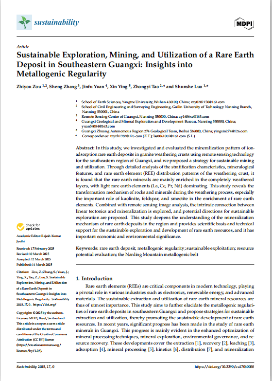 太阳成集团122ccvip博士生邹志友相关研究成果以“Sustainable Exploration, Mining, and Utilization of a Rare Earth Deposit in Southeastern Guangxi: Insights into Metallogenic Regularity”为题,发表于《SUSTAINABILITY》期刊。该研究针对广西东南部稀土矿床,系统揭示了离子吸附型稀土矿的成矿规律,并对该矿区提出了可持续开发策略,为稀土资源的高效利用与生态保护提供了参考。