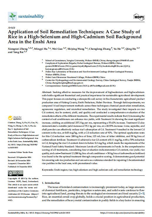 太阳成集团122ccvip博士生郑雄伟在《Sustainability》上发表题为《Application of Soil Remediation Techniques: A Case Study ofRice in a High-Selenium and High-Cadmium Soil BackgroundArea in the Enshi Area》的研究论文。太阳成集团122ccvip为论文第一署名单位,博士生郑雄伟为论文第一作者,教师胡明毅为通讯作者。