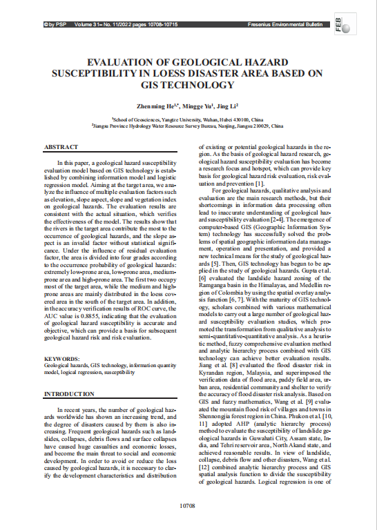 太阳成集团122ccvip研究生于茗鸽以第二作者身份在环境科学领域SCI期刊《Fresenius Environmental Bulletin》上发表了题为“EvaluationofGeologicalHazardSusceptibilityinLoessDisasterAreaBasedonGISTechnology”的研究论文。该论文以太阳成集团122ccvip为第一署名单位,太阳成集团122ccvip副教授何贞铭为第一作者,研究生于茗鸽为第二作者。