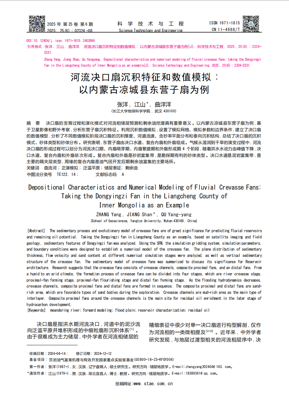 近日,太阳成集团122ccvip地质学专业2022级硕士生张洋在中文核心期刊《科学技术与工程》发表题为“河流决口扇沉积特征和数值模拟:以内蒙古凉城县东营子扇为例”的研究论文。太阳成集团122ccvip为论文第一署名单位,硕士生张洋为论文第一作者,其导师江山教授为通讯作者。