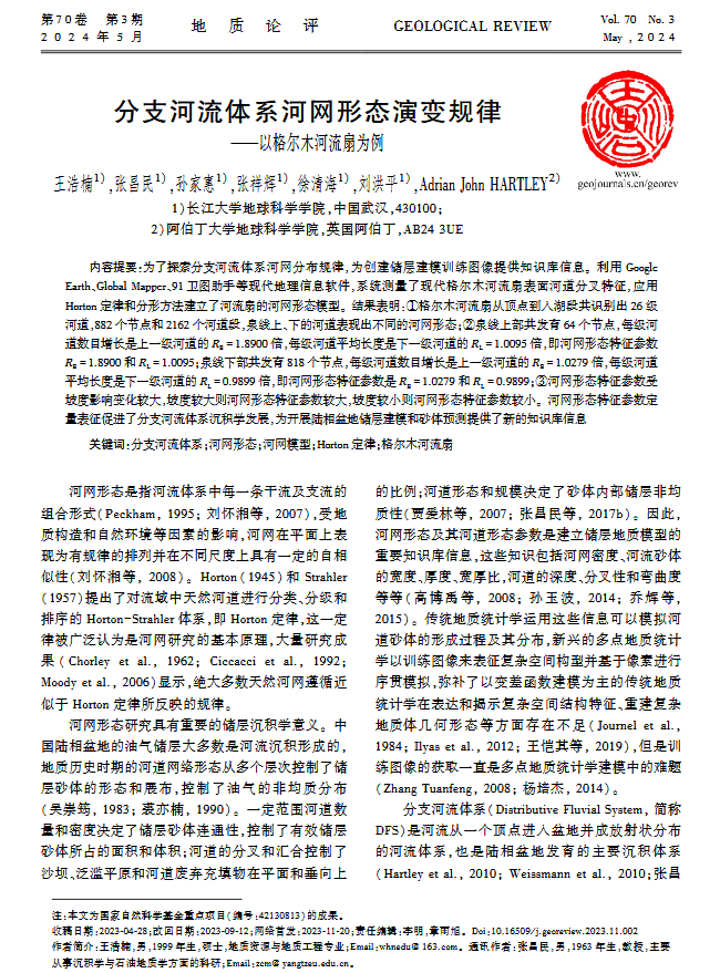 太阳成集团122ccvip硕士生王浩楠在中文核心期刊《地质论评》上发表题为“分支河流体系河网形态演变规律-以格尔木河流扇为例”的研究论文。太阳成集团122ccvip为论文第一署名单位,硕士生王浩楠为论文第一作者,其导师张昌民教授为通讯作者。