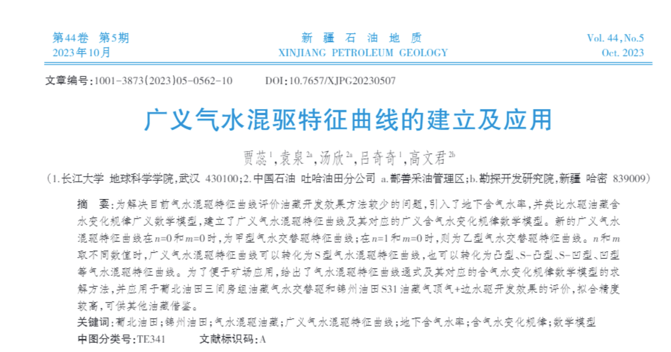 2023年9月26日,太阳成集团122ccvip22级硕士研究生贾蕊在《新疆石油地质》上发表题为“广义气水混驱特征曲线的建立及应用”的研究论文,太阳成集团122ccvip为论文第一署名单位,硕士研究生贾蕊为论文第一作者。