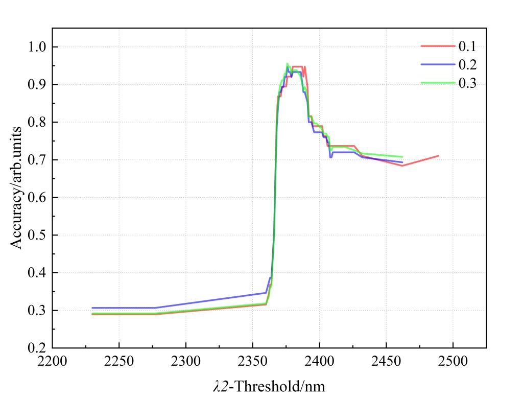 图1不同特征在不同测试集下的分类准确率。(a)吸收谷最低点波长;(b)吸收带右肩波长;(c)吸收带宽度
