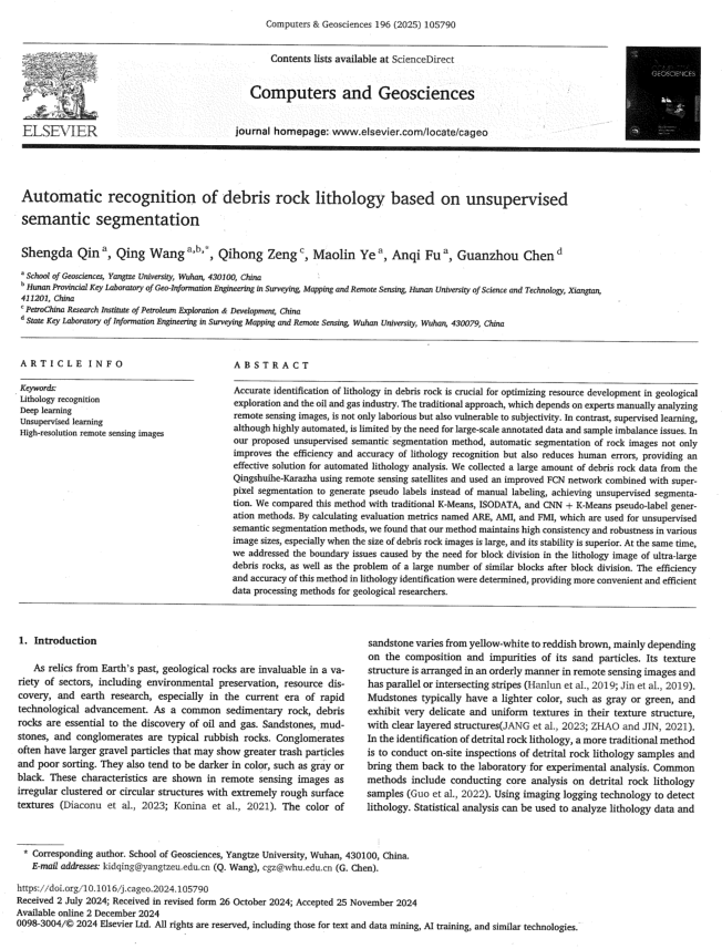 近日,太阳成集团122ccvip测绘工程专业2025级硕士生秦声炟在SCI-2区期刊《Computers & Geosciences》发表题为“Automatic recognition of debris rock lithology based on unsupervised semantic segmentation”的研究论文。太阳成集团122ccvip为论文第一署名单位,硕士生秦声炟为论文第一作者,其导师王庆副教授为通讯作者。
