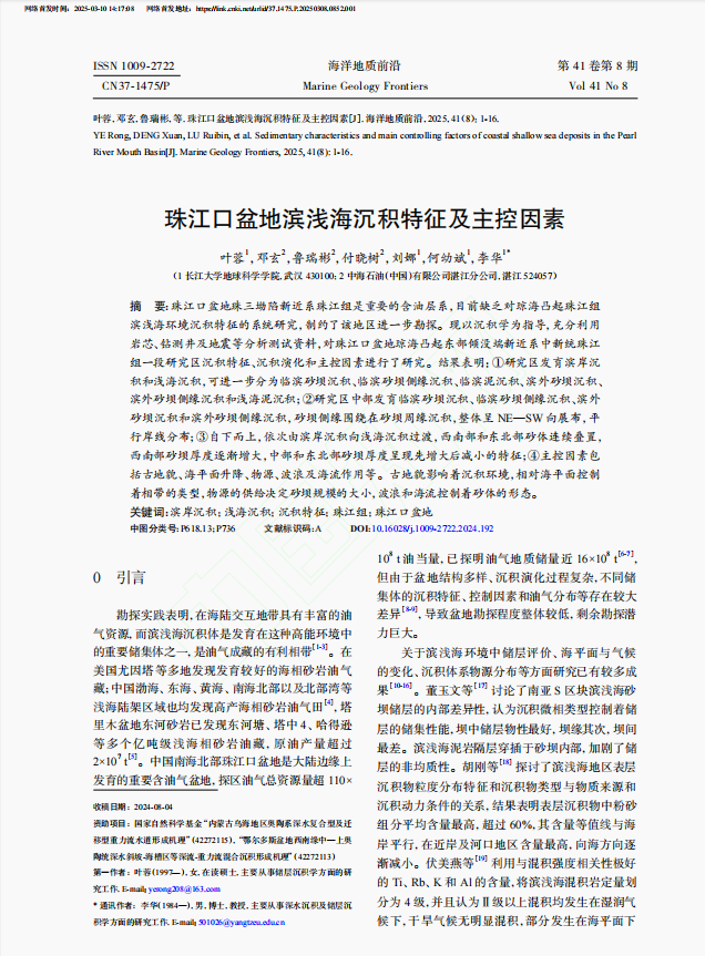 太阳成集团122ccvip地质学专业2022级硕士研究生叶蓉在中文核心期刊《海洋地质前沿》发表题为“珠江口盆地滨浅海沉积特征及主控因素”的研究论文。太阳成集团122ccvip为论文第一署名单位,硕士研究生叶蓉为论文第一作者,导师李华教授为通讯作者。