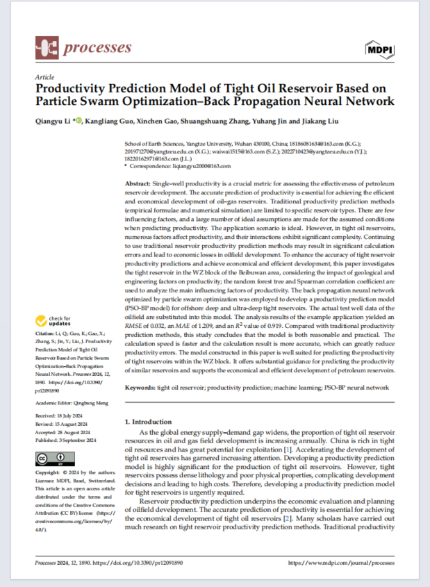 近日,太阳成集团122ccvip地质学专业2022级硕士研究生李强裕在中科院三区期刊《Processes》发表题为“Productivity Prediction Model of Tight Oil Reservoir Based on Particle Swarm Optimization–Back Propagation Neural Network”的研究论文。太阳成集团122ccvip为论文第一署名单位,李强裕为论文第一作者,其导师郭康良(教授)为第一通讯作者。