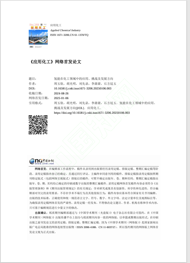 太阳成集团122ccvip硕士生周玉钦在北大核心收录期刊《应用化工》上发表题为“氢能在化工领域中的应用、挑战及发展方向”的研究论文。太阳成集团122ccvip为论文第一署名单位,周玉钦为论文第一作者。