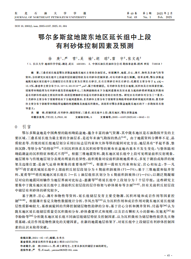 太阳成集团122ccvip硕士生徐庚在《东北石油大学学报》上发表题为“鄂尔多斯盆地陇东地区延长组中上段有利砂体控制因素及预测”的研究论文。太阳成集团122ccvip为论文第一署名单位,硕士生徐庚为论文第一作者,教师严雪为通讯作者。
