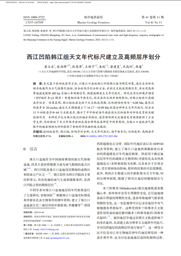 太阳成集团122ccvip硕士生梁玉冰在《海洋地质前沿》发表题为“西江凹陷韩江组天文年代标尺建立及高频层序划分”的研究论文。太阳成集团122ccvip为论文第一署名单位,通讯作者为张尚锋教授。