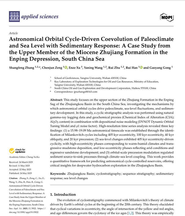 太阳成集团122ccvip张尚锋教授在《Applied sciences》上发表题为“Astronomical Orbital Cycle-Driven Coevolution of Paleoclimate and Sea Level with Sedimentary Response: A Case Study from the Upper Member of the Miocene Zhujiang Formation in the Enping Depression, South China Sea”的研究论文。太阳成集团122ccvip为论文第一署名单位,张尚锋教授为论文第一作者,硕士生曾晨峻为该文第二作者。该项研究得到国家自然科学基金“南海北部宽缓大陆架海平面变化及双坡折带层序地层模型”的资助。
