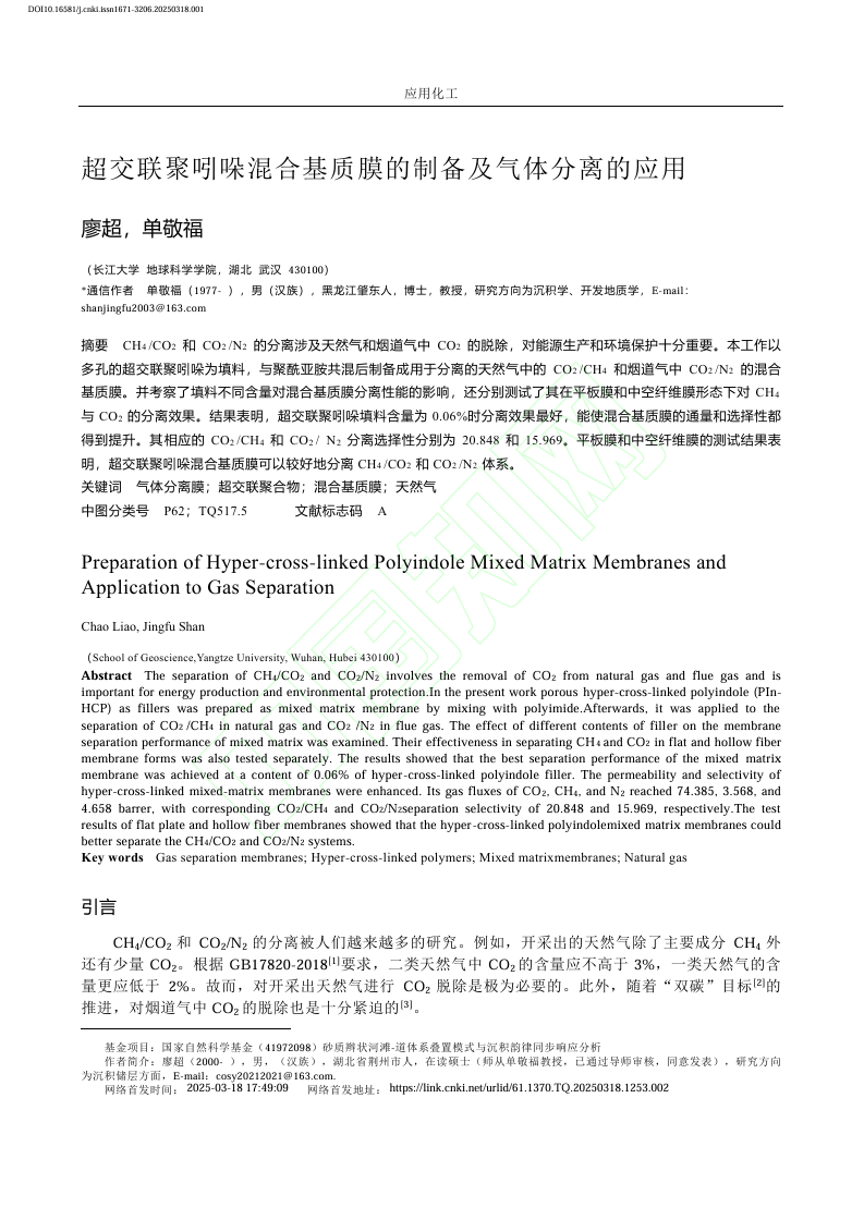 近日,太阳成集团122ccvip硕士生廖超在中文核心期刊《应用化工》上发表题为“超交联聚吲哚混合基质膜的制备及气体分离的应用”的研究论文。该论文以多孔的超交联聚吲哚为填料,与聚酰亚胺共混后制备成用于分离的天然气中的CO2/CH4和烟道气中CO2/N2的混合基质膜。太阳成集团122ccvip为论文第一署名单位,硕士生廖超为论文第一作者。
