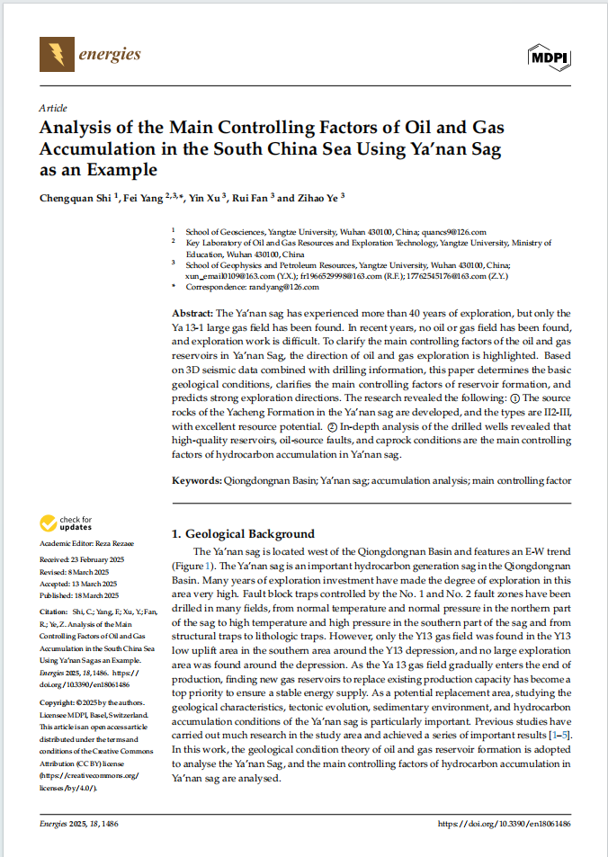 太阳成集团122ccvip地质资源与地质工程专业2022级研究生史成全在中科院四区期刊《Energies》(IF3.0)发表题为“Analysis of the Main Controlling Factors of Oil and Gas Accumulation in the South China Sea Using Ya’nan Sag as an Example”的研究论文。太阳成集团122ccvip为论文第一署名单位,研究生史成全为论文第一作者,其导师杨飞副教授为通讯作者。