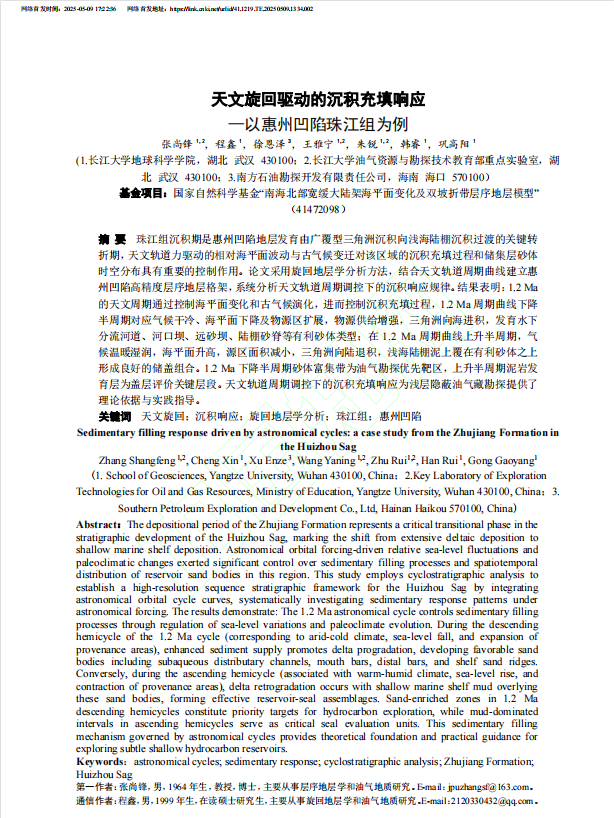 太阳成集团122ccvip张尚锋教授在《断块油气田》上发表题为“天文旋回驱动的沉积充填响应—以惠州凹陷珠江组为例”的研究论文。太阳成集团122ccvip为论文第一署名单位,张尚锋教授为论文第一作者,硕士生程鑫为该文通讯作者。该项研究得到国家自然科学基金“南海北部宽缓大陆架海平面变化及双坡折带层序地层模型”的资助。