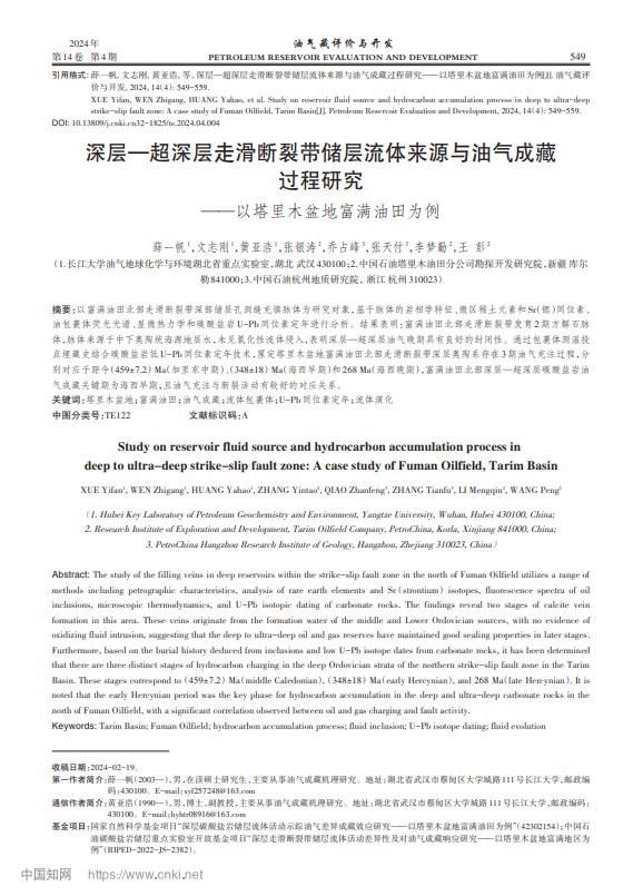 太阳成集团122ccvip研究生薛一帆以第一作者身份在北大核心期刊《油气藏评价与开发》上发表题为“深层—超深层走滑断裂带储层流体来源与油气成藏过程研究——以塔里木盆地富满油田为例”的研究论文,太阳成集团122ccvip油气地球化学与环境湖北省重点实验室为论文第一署名单位,薛一帆为第一作者。