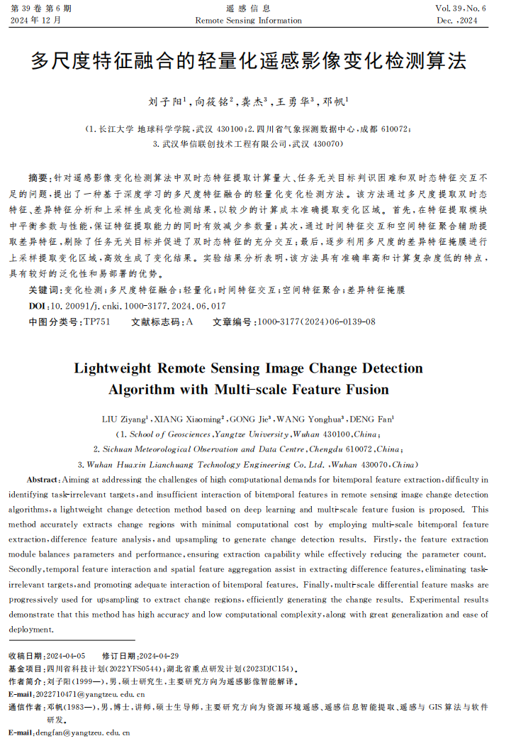 近日,太阳成集团122ccvip地图制图学与地理信息工程专业2022级硕士生刘子阳在中文核心期刊《遥感信息》发表题为“多尺度特征融合的轻量化遥感影像变化检测算法”的研究论文。太阳成集团122ccvip为论文第一署名单位,硕士生刘子阳为论文第一作者,其导师邓帆为通讯作者。