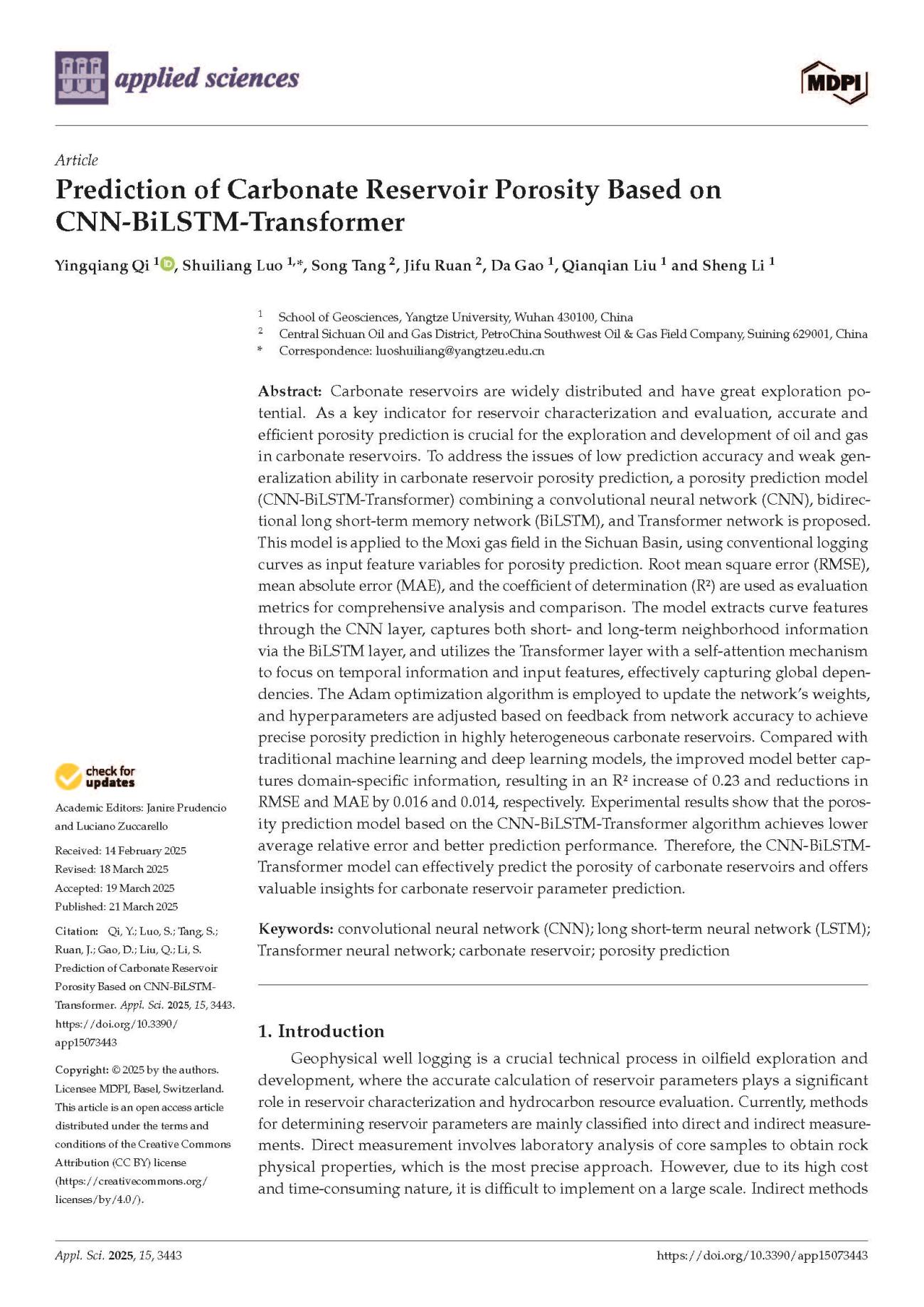 太阳成集团122ccvip硕士生漆影强在SCI收录期刊《Applied Sciences》上发表题为“Prediction of Carbonate Reservoir Porosity Based on CNN-BiLSTM-Transformer”的研究论文。太阳成集团122ccvip为论文第一署名单位,罗水亮副教授为第一通讯作者,论文由中国青年基金国家自然科学基金项目资助。