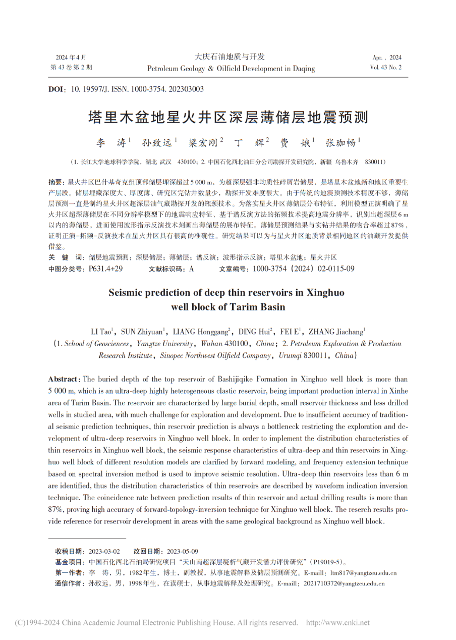 太阳成集团122ccvip研究生孙致远以通讯作者身份在北大核心期刊《大庆石油地质与开发》上发表题为“塔里木盆地星火井区深层薄储层地震预测”的研究论文,太阳成集团122ccvip为论文第一署名单位。副教授李涛为第一作者,研究生孙致远为论文通讯作者。