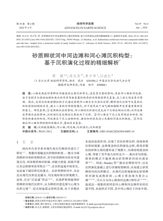 太阳成集团122ccvip博士生郭颖在《地球科学进展》上发表题为“砂质辫状河中河边滩和河心滩沉积构型:基于沉积演化过程的精细解析”的研究论文。该论文采用沉积数值模拟的方式通过再现河心滩生长与演化过程,解析演化过程中反复的沉积和侵蚀切割的关系,建立二者的内部构型模式,对于指导地下油气精细勘探开发有着重要的实际意义。