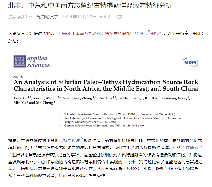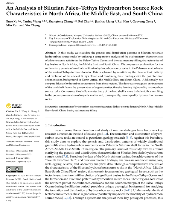 太阳成集团122ccvip博士生徐恩泽在Applied Sciences-Basel发表题为“An Analysis of Silurian Paleo–Tethys Hydrocarbon Source Rock Characteristics in North Africa, the Middle East, and South China”的研究论文,通讯作者为王雅宁副教授。