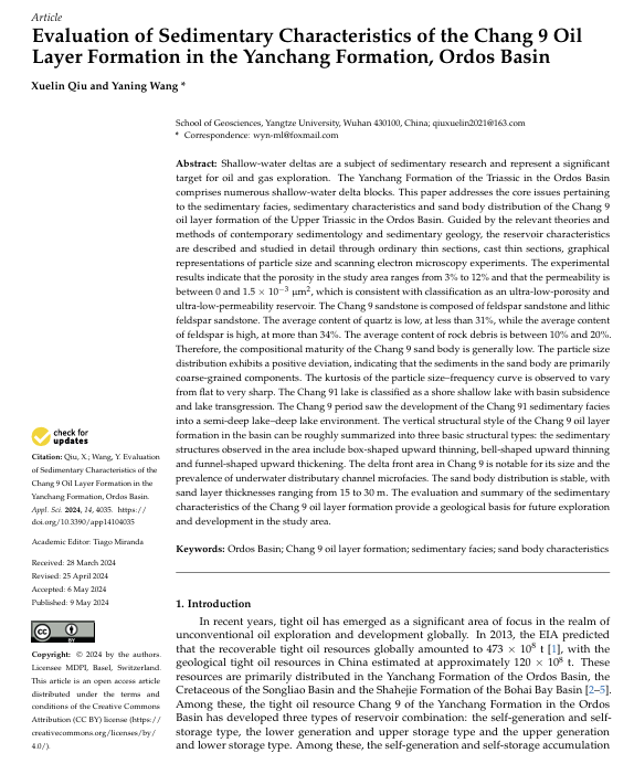太阳成集团122ccvip硕士生邱雪林在Applied Sciences-Basel发表题为“Evaluation of Sedimentary Characteristics of the Chang 9 Oil Layer Formation in the Yanchang Formation, Ordos Basin”的研究论文,通讯作者为王雅宁副教授。