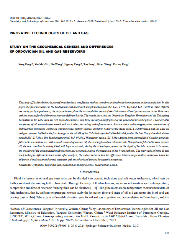 太阳成集团122ccvip研究生母鑫以通讯作者身份在《CHEMISTRY AND TECHNOLOGY OF FUELS AND OILS》上发表题为“Study on the Geochemical Genesis and Differences of Ordovician Oil and Gas Reservoirs”的研究论文。对含油气盆地流体包裹体的研究,是认识油气运移和成藏的有效方法。文章通过实验对塔河油田TS3井、TP18井、YQ8井和YJ2-3井随钻取出的奥陶系碳酸盐岩地层样品中的流体包裹体进行分析,旨在探究塔河地区奥陶系油气藏的成藏期次及不同区块之间存在差异的原因。结果表明:塔河地区奥陶系鹰山组和一间房组地层流体包裹体种类丰富,相态上既有油、气、盐水单一相,同样存在油、气、水的两相或多相。根据烃类包裹体的荧光特性和均一温度,结合研究区的埋藏史-热演化史分析确定出塔河油田油气藏为4期充注,分别是加里东中期(454-446Ma)、海西晚期-印支期(255-217Ma)、燕山晚期(143-99Ma)、喜马拉雅期(25-5Ma)。其中加里东中期主要为低熟油充注,夹少量成熟油;海西晚期主要高熟油,夹部分成熟油的充注;燕山晚期主要是高熟油的充注;喜马拉雅期随着埋深的不断增加,发生油气藏的裂解,主要是气烃的活动。本次研究所选的4口井属于不同的构造单元,经过分析笔者认为单井之间的差异一方面是烃类热演化程度的影响,另一方面是受构造运动的影响。
