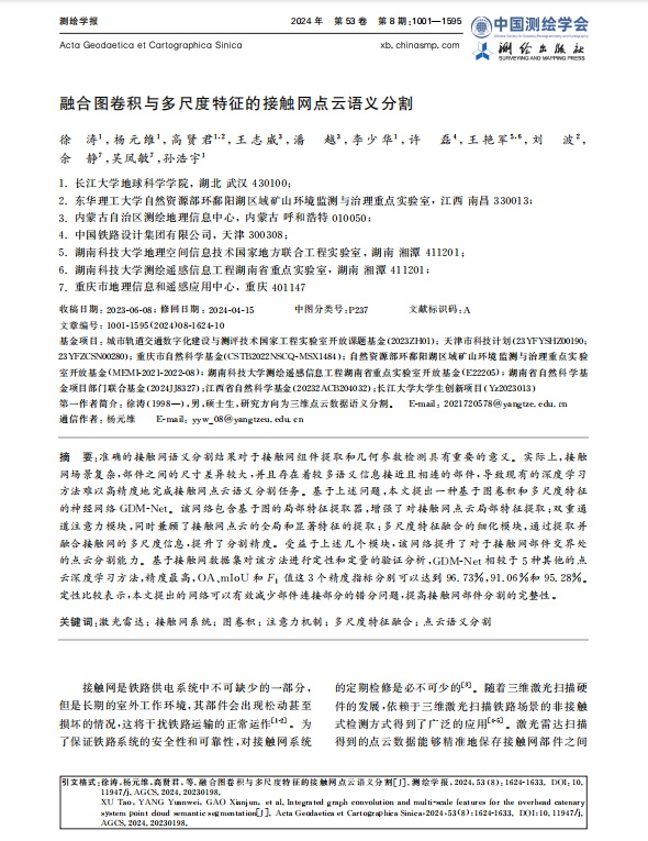太阳成集团122ccvip硕士生徐涛在测绘领域主流期刊《测绘学报》上发表题为“融合图卷积与多尺度特征的接触网点云语义分割”的研究论文。