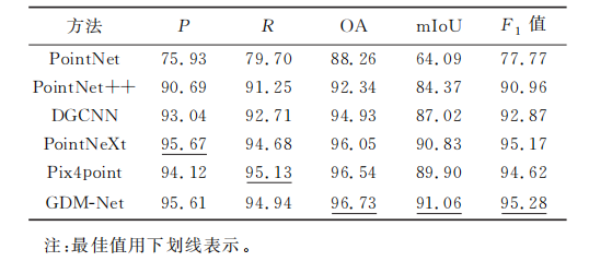 该研究主要针对接触网场景复杂,部件之间的尺寸差异较大,并且存在着较多语义信息接近且相连的部件,导致现有的深度学习方法难以高精度地完成接触网点云语义分割任务。因此,本文提出了一种基于图卷积和多尺度特征的神经网络GDM-Net(图1)。该网络包含基于图的局部特征提取器,增强了对接触网点云局部特征提取;双重通道注意力模块,同时兼顾了接触网点云的全局和显著特征的提取;多尺度特征融合的细化模块,通过提取并融合接触网的多尺度信息,提升了分割精度。受益于上述几个模块,该网络提升了对于接触网部件交界处的点云分割能力。基于接触网数据集对该方法进行定性和定量的验证分析,GDM-Net相较于5种其他的点云深度学习方法,精度最高,OA、mIoU和F1值这3个精度指标分别可以达到96.73%,91.06%和95.28%(图2)。实验表明,本文提出的网络可以有效减少部件连接部分的错分问题,提高接触网部件分割的完整性。