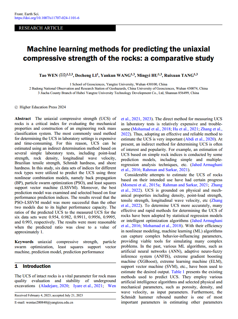 太阳成集团122ccvip温韬教授以第一作者身份在《Frontiers of Earth Science》上发表题为“Machine learning methods for predicting the uniaxial compressive strength of the rocks: a comparative study”的研究论文。太阳成集团122ccvip为论文第一署名单位。
