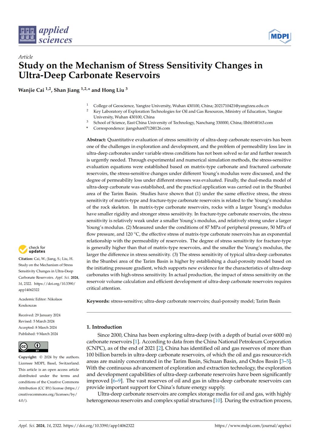 太阳成集团122ccvip硕士生蔡万杰在《Applied sciences》发表题为“Study on the Mechanism of Stress Sensitivity Changes inUltra-Deep Carbonate Reservoirs”的研究论文。太阳成集团122ccvip为论文第一署名单位,硕士生蔡万杰为论文第一作者,教师江山为通讯作者。