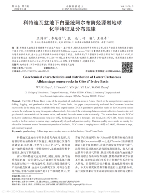 太阳成集团122ccvip博士生王博宇在《中国科技论文》上发表题为《科特迪瓦盆地下白垩统阿尔布阶烃源岩地球化学特征及分布规律》的研究论文。太阳成集团122ccvip为论文第一署名单位,博士生王博宇为论文第一作者,教师王振奇为通讯作者。