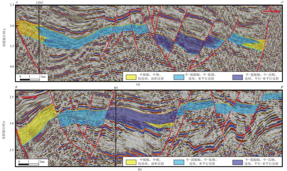 论文针对南堡凹陷烃源岩在不同次凹中具有明显非均质性这一问题,深入开展烃源岩层系识别与分布预测研究。选取对有机质较敏感的测井曲线,对研究区不同沉积相带采用Δlg R法和多元线性回归法分别建立烃源岩TOC定量预测模型,并依据预测结果对比验证,优选预测模型;同时确立工区烃源岩地震反射特征与地化特征的对应关系,建立单井烃源岩-地震相-沉积相关系,并进行横向追踪。结果表明,研究区多元线性回归法预测TOC误差较小,可较好地满足TOC预测精度。优质烃源岩TOC测井曲线以箱形为主,偶夹锯齿状特征曲线,地震反射特征主要呈中-强振幅、中-高频、高连续性,并具亚平行-平行反射结构;中等烃源岩TOC测井曲线以高值尖峰锯齿状为主,地震反射特征为中-弱振幅、中-低频、连续-较连续,并具亚平行反射结构。结论 南堡凹陷沙一段烃源岩主要在3个区域发育,面积最大的地区位于林雀次凹5号和1号构造带之间,其次为高柳断层与西南庄断层接合部的上盘以及3号构造带附近。研究结果可为南堡凹陷非常规油气藏勘探开发提供理论指导。