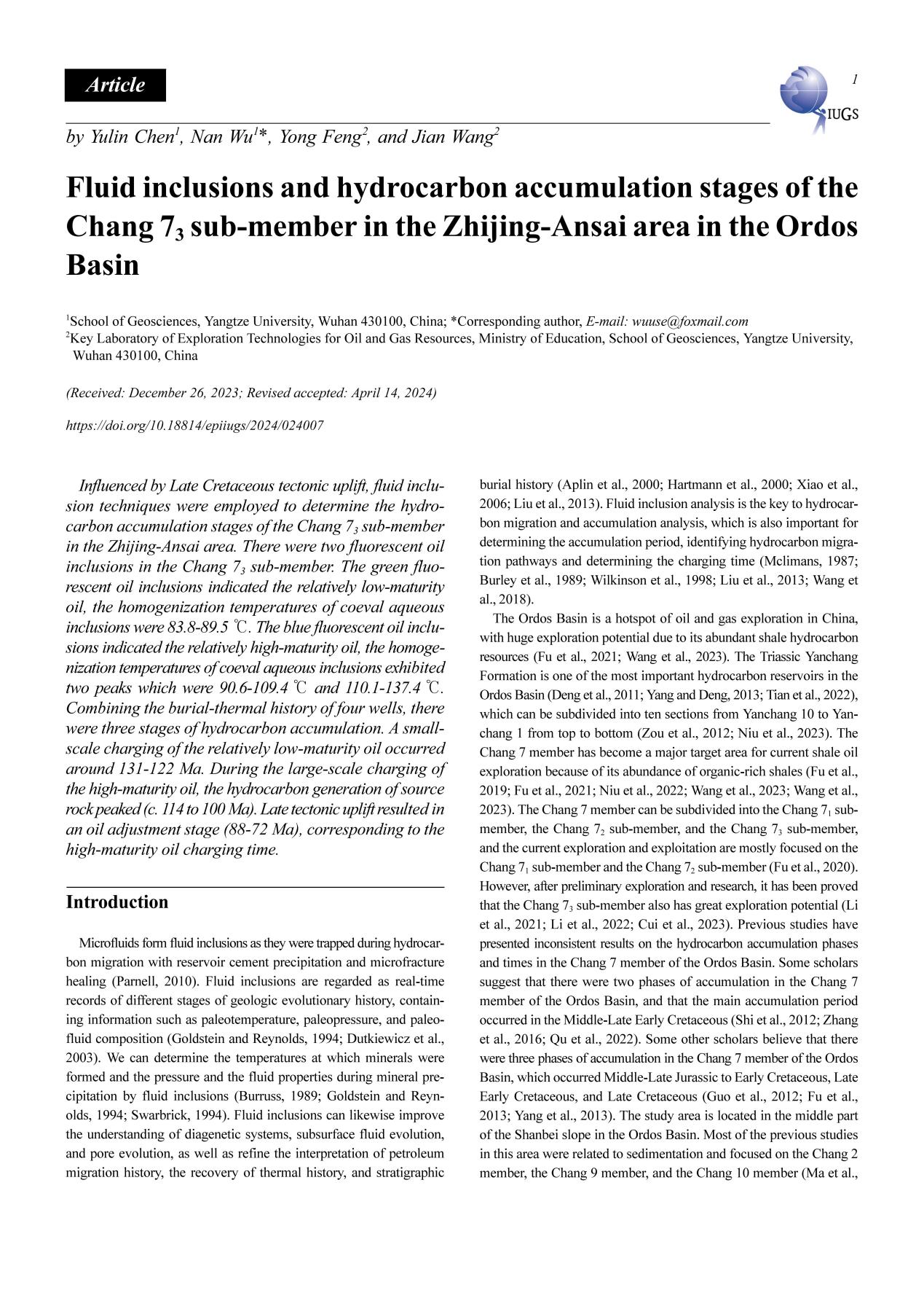 太阳成集团122ccvip硕士生陈雨霖在《EPISODES》上发表题为“Fluid inclusions and hydrocarbon accumulation stages of the Chang 73 sub-member in the Zhijing-Ansai area in the Ordos Basin”的研究论文。太阳成集团122ccvip为论文第一署名单位,硕士生陈雨霖为论文第一作者,教师吴楠为通讯作者。