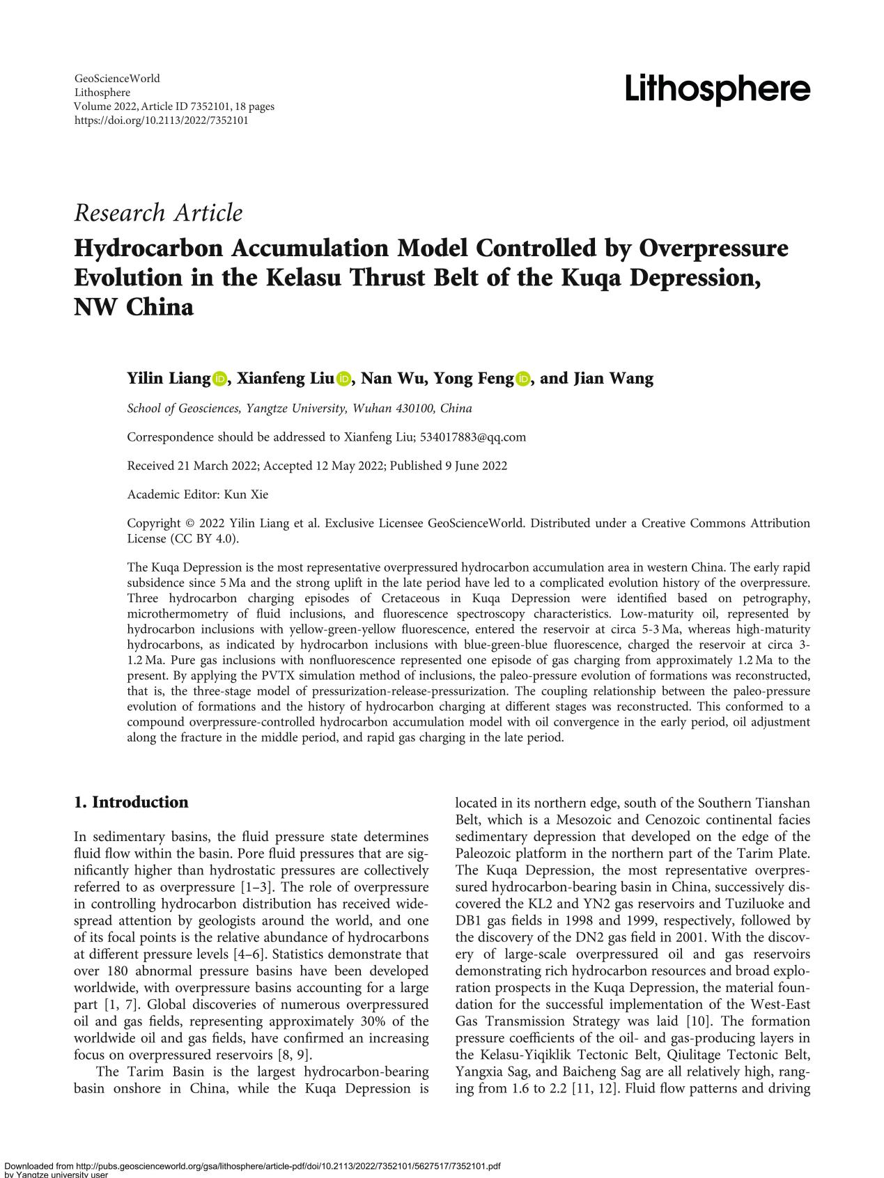 太阳成集团122ccvip博士生梁祎琳在《LITHOSPHERE》上发表题为“Hydrocarbon Accumulation Model Controlled by Overpressure Evolution in the Kelasu Thrust Belt of the Kuqa Depression, NW China”的研究论文。太阳成集团122ccvip为论文第一署名单位,博士生梁祎琳为论文第一作者,教师刘显凤为通讯作者。