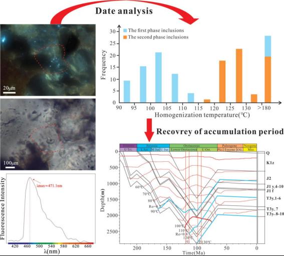 为了进一步明确鄂尔多斯盆地中部志靖-安塞地区中生代三叠系延长组长7段页岩油成藏期,利用流体包裹体岩相学分析、显微温度、盐度分析和荧光光谱分析方法,结合该地区埋藏史-热历史恢复,综合分析了该地区延长组长七段的油气成藏期。结果表明,延长组长7段流体包裹体可分为两个阶段。第一阶段包裹体主要发育液态烃包裹体和大量伴生的卤水包裹体,主要为裂隙充填石英和裂隙充填方解石中的串珠状包裹体。荧光颜色为蓝色和蓝绿色,伴生卤水包裹体的均一化温度在90-110℃之间。它们大多分布在裂隙充填的石英中,伴生卤水包裹体的温度在120-130℃之间。延长组长7储层流体包裹体可分为两个阶段。延长组长7段CO2包裹体和高温包裹体主要来源于地壳深部火山活动。