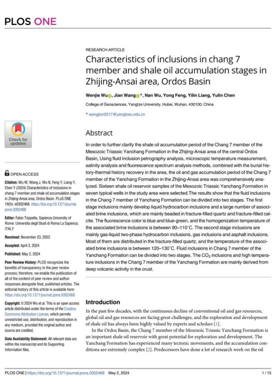 太阳成集团122ccvip硕士生吴文杰在《PLOSONE》发表题为“Characteristics of inclusions in chang 7 member and shale oil accumulation stages in Zhijing-Ansai area, Ordos Basin”的研究论文。太阳成集团122ccvip为论文第一署名单位,硕士生吴文杰为论文第一作者,教师王健为通讯作者。