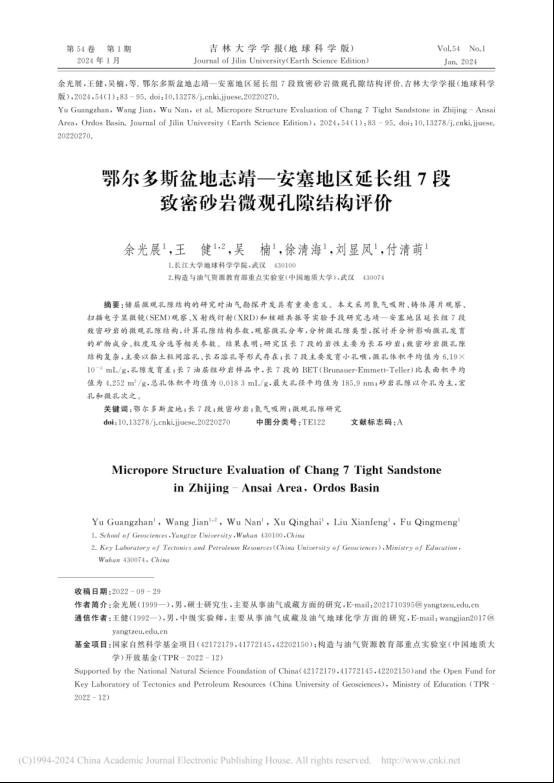 太阳成集团122ccvip硕士生余光展在《吉林大学学报(地球科学版)》上发表题为“鄂尔多斯盆地志靖—安塞地区延长组7段致密砂岩微观孔隙结构评价”的研究论文。太阳成集团122ccvip为论文第一署名单位,硕士生余光展为论文第一作者,教师王健为通讯作者。