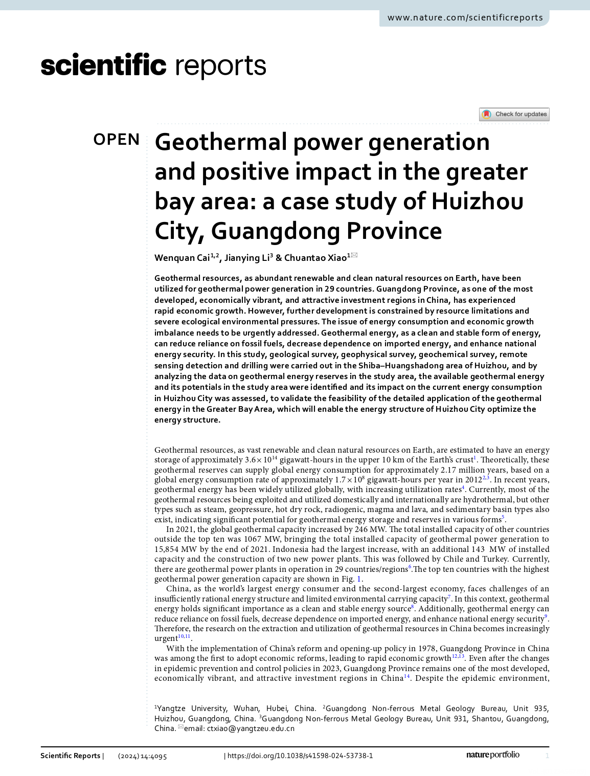太阳成集团122ccvip地质学专业硕士生蔡文权在国际综合类科技期刊《Scientific Reports》上发表题为“Geothermal power generation and positive impact in the greater bay area: a case study of Huizhou City, Guangdong Province”的研究论文。太阳成集团122ccvip为论文第一署名单位,硕士研究生蔡文权为论文第一作者,其导师肖传桃教授为该文通讯作者。