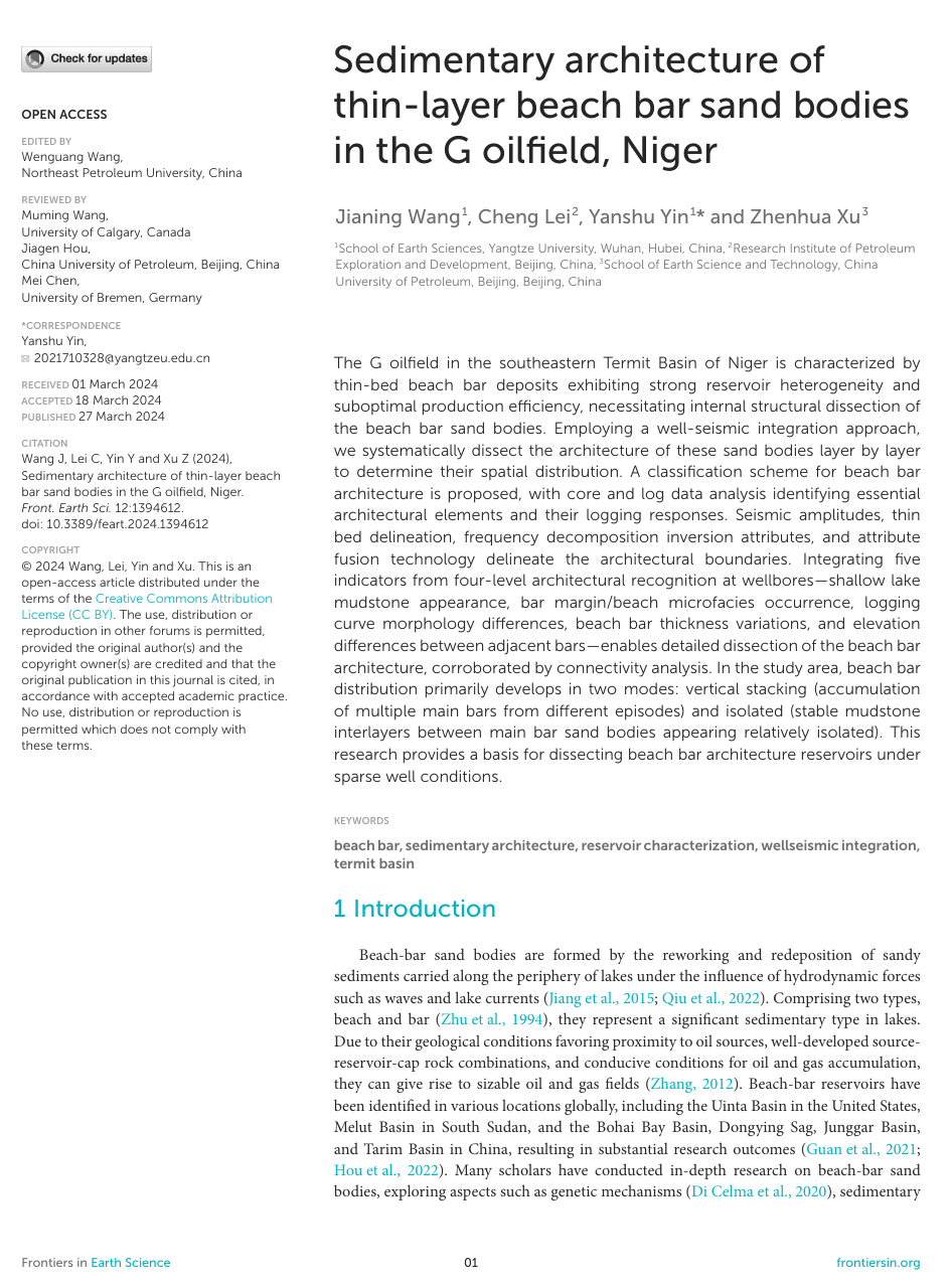 太阳成集团122ccvip硕士研究生王嘉宁在《Frontiers in Earth Science》上发表题目为“Sedimentary architecture of thin-layer beach bar sand bodies in the G oilfield, Niger”的研究论文。太阳成集团122ccvip为论文的第一署名单位,王嘉宁为论文的第一作者,尹艳树教授为通讯作者。