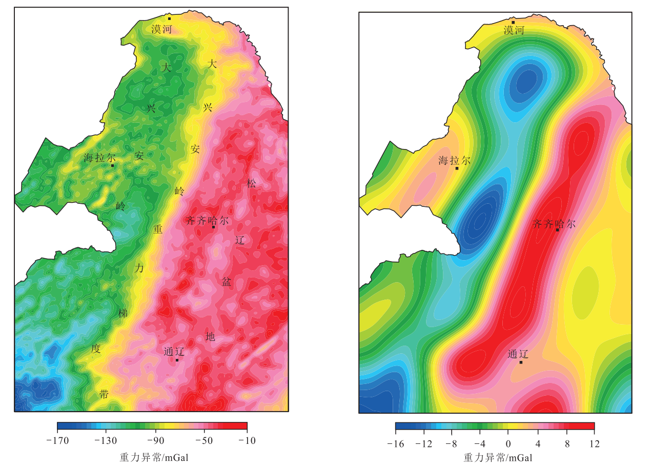 图2 大兴安岭与邻区重力异常(左) 大兴安岭与邻区深源重力异常(右)
