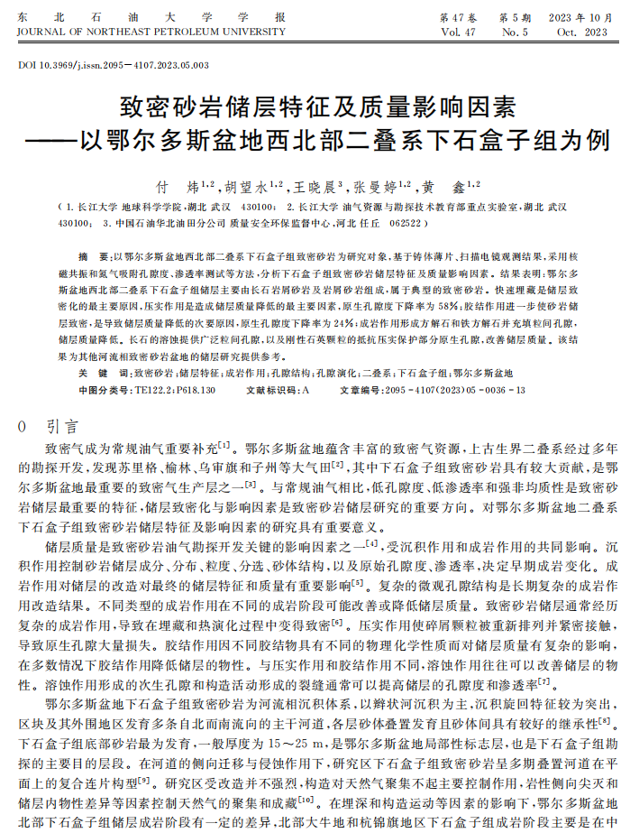 太阳成集团122ccvip博士生付炜在期刊《东北石油大学学报》上发表题为“致密砂岩储层特征及质量影响因素———以鄂尔多斯盆地西北部二叠系下石盒子组为例”的研究论文。太阳成集团122ccvip为论文第一署名单位,胡望水教授为通讯作者,本项研究得到国家自然科学基金重点项目项目资助。