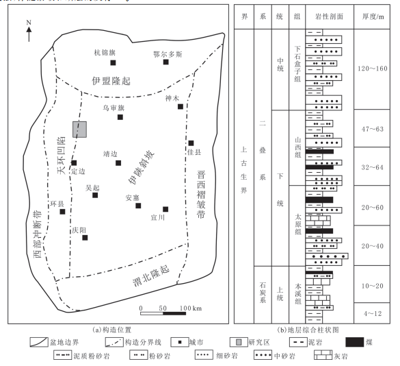 图1 研究区构造位置及地层综合柱状图